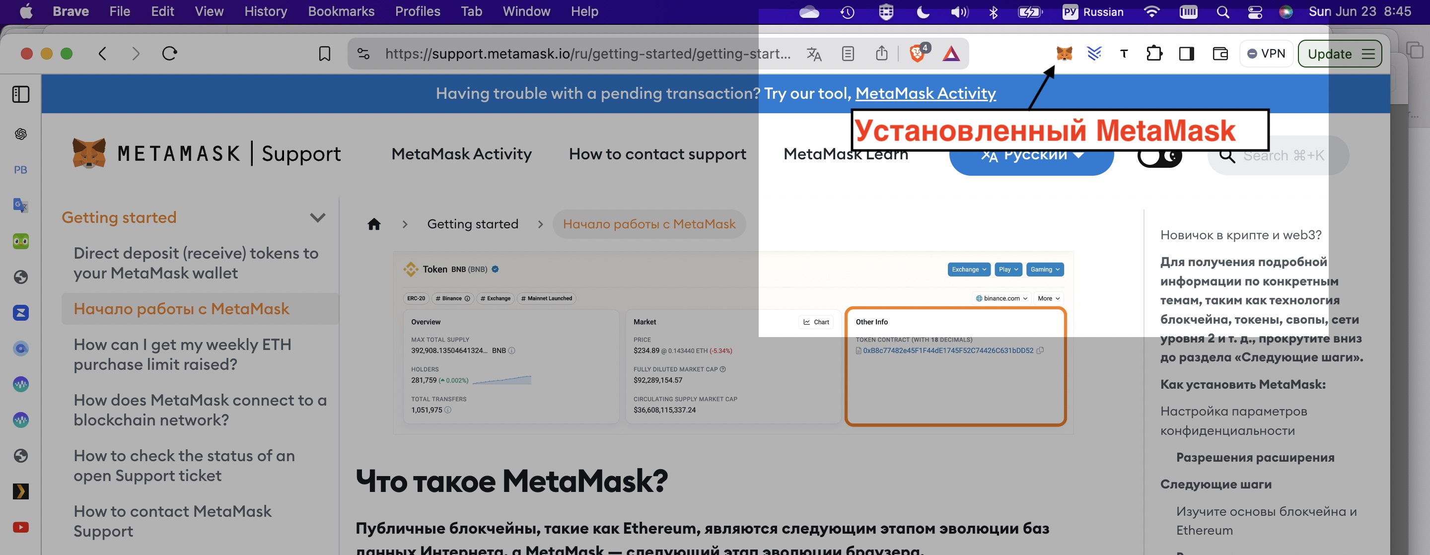 Установленный MetaMask на панели инструментов браузера Brave